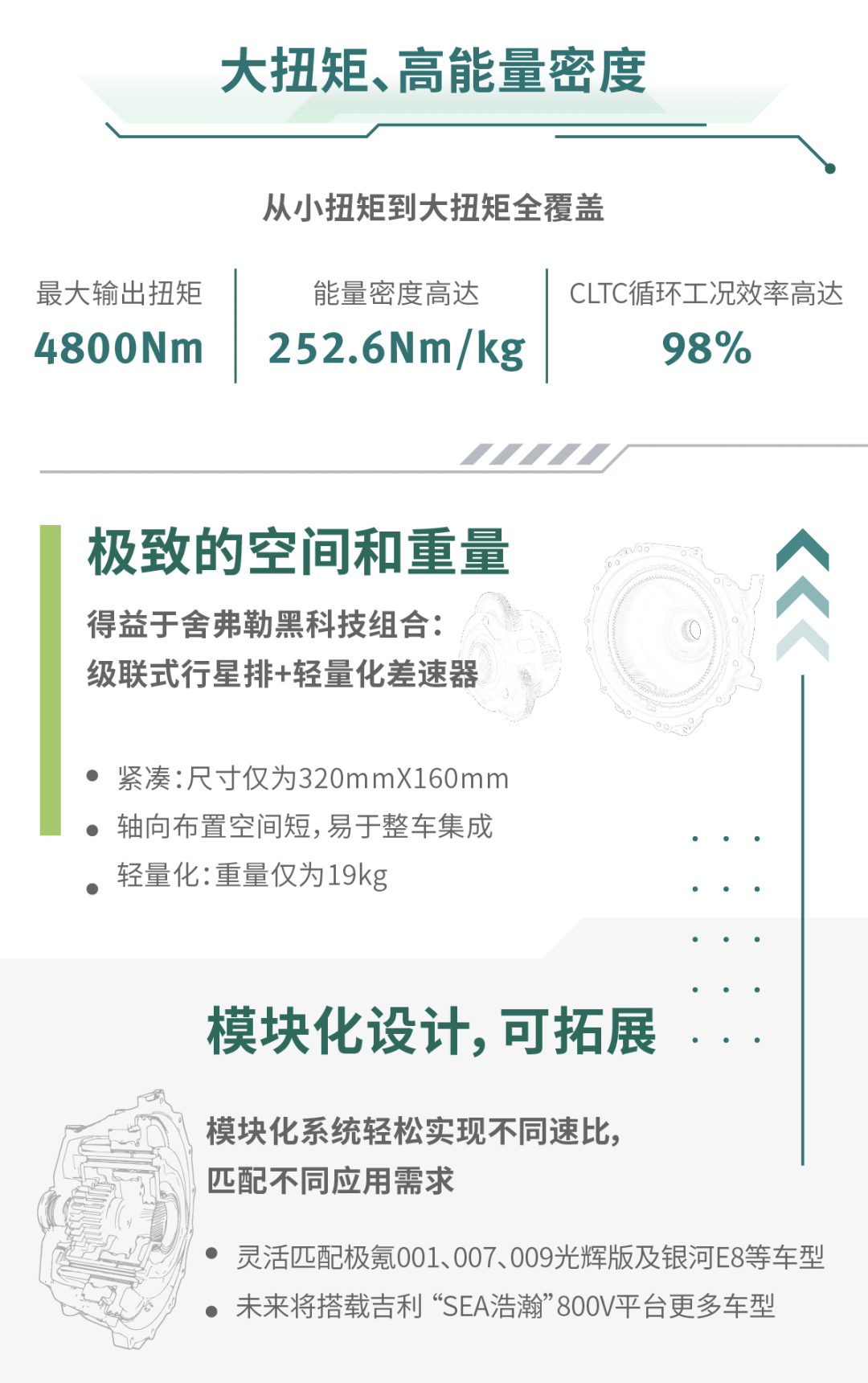 2023年底,舍弗勒面向大扭矩應用的高性能同軸減速箱在太倉制造基地投產(chǎn)。4800Nm的最大輸出扭矩,252.6Nm/kg的能量密度,98%的CLTC循環(huán)工況效率,讓這款產(chǎn)品成為舍弗勒在電氣化領域的又一金字招牌。在設計上,這款產(chǎn)品順應各大主機廠的產(chǎn)品布局方向,主要瞄準800V高壓平臺應用,提升補能效率。得益于舍弗勒在電驅動領域豐富的設計和應用經(jīng)驗,這款產(chǎn)品在空間、重量和性能等方面具有顯著優(yōu)勢。