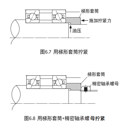 梯形套筒將因油壓而膨脹的套筒插到軸上,施加所需的壓入力(擰緊力)后,除去油壓,在將套筒固定在軸上的同時向軸承施加抒緊力,是一種比較容易的固定方法。
