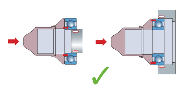 安裝內(nèi)圈過盈配合的軸承時,不能通過外圈和滾動體把力傳遞給內(nèi)圈。這會把軸承滾道和滾動體表面敲壞,使軸承在運轉(zhuǎn)時產(chǎn)生噪音并提前損壞。正確的方法應(yīng)該用套筒直接把力作用在內(nèi)圈端面上。