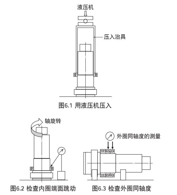 然后,在壓入內(nèi)圈時,應(yīng)使用內(nèi)圈壓入工具,確實將其壓入軸肩(請勿向外圈加力)。壓入后,測量軸承各部位的精度,確認是否確實安裝在軸上。另外,組配使用多列軸承時,在組裝后應(yīng)測量其跳動,修正外圈間的軸心偏差。