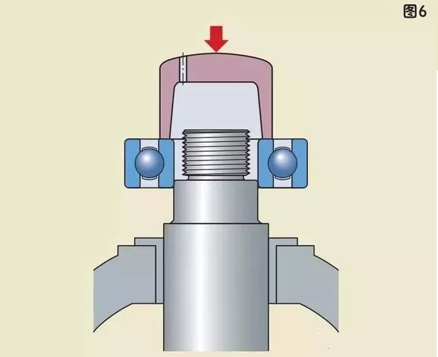 安裝配合不是太緊的小軸承時,可以通過一個套筒(圖5、圖6)并以錘擊的方法,輕輕敲擊套筒把軸承裝到合適的位置。敲擊時應(yīng)盡量均勻的作用在軸承套圈上,以防止軸承傾斜或歪斜。